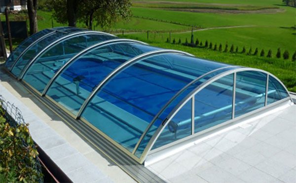 - Розсувні павільйони для басейнів, що складаються з алюмінієвого профілю та полікарбонату. Надійно закривають чашу та обладнання. Не вимагають трудомісткої установки. Крім того, привабливо виглядають на тлі загального ландшафту.